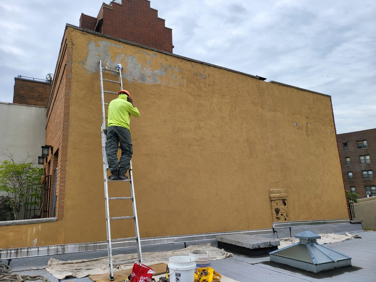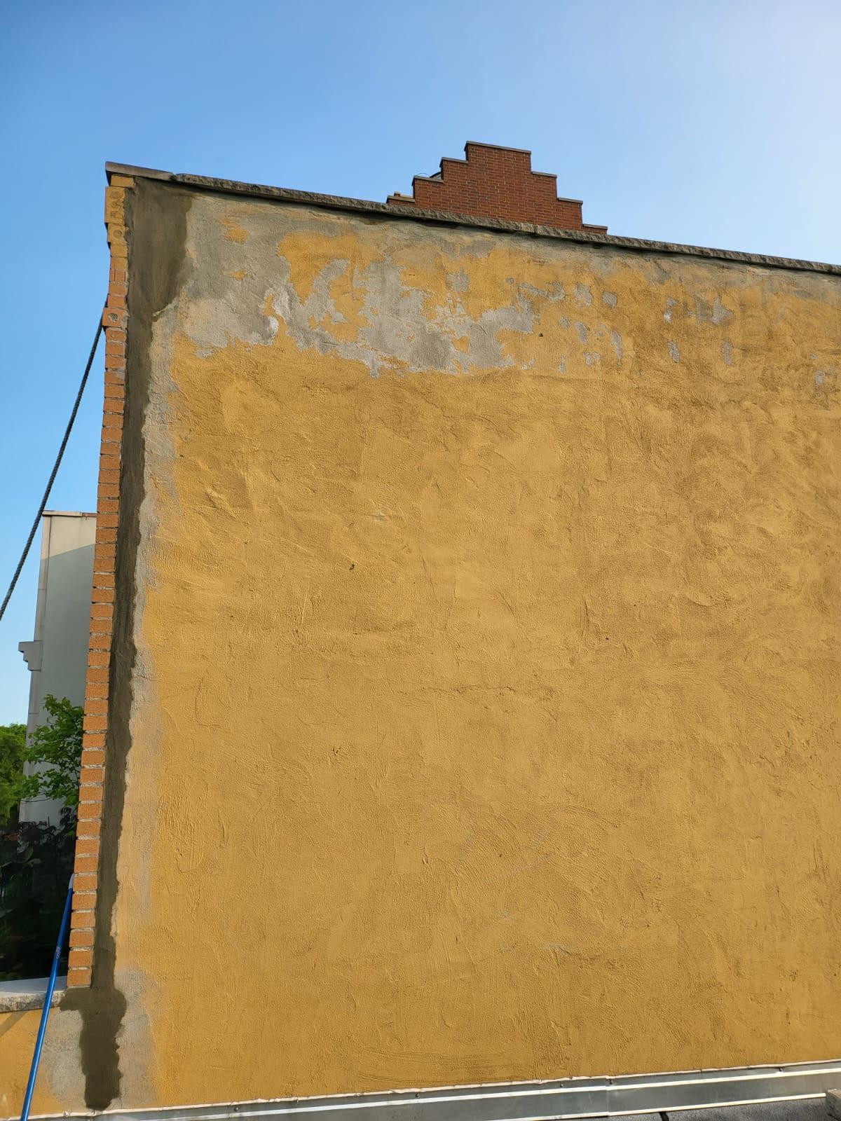 For the left side wall, we will remove the loose old cement, then do a regular wash, apply new cement, and finally apply a waterproof coat of paint.