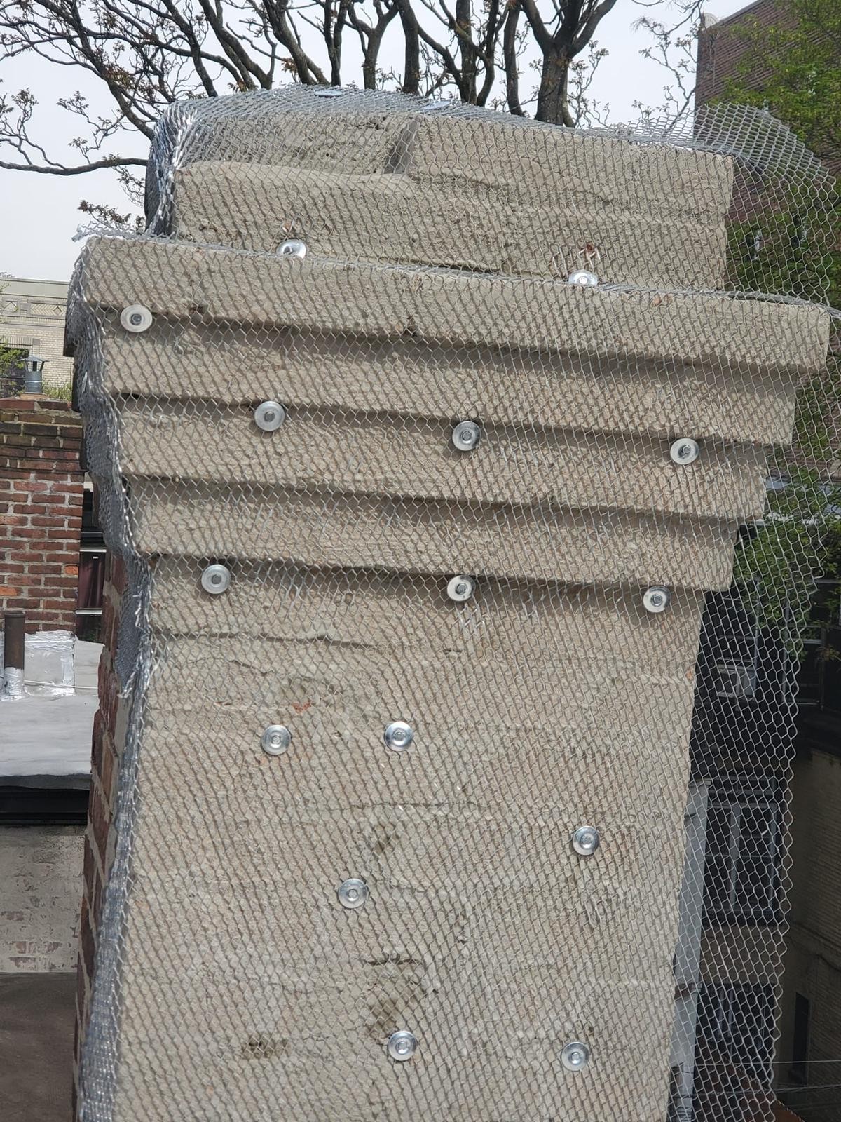 Chimney old stucco to be removed, then apply wash, after put wire mesh, then apply glue, then apply two coats of cement stucco: 1st coat is scratch coat, and 2nd coat is final coat, then after apply waterproof through coat.