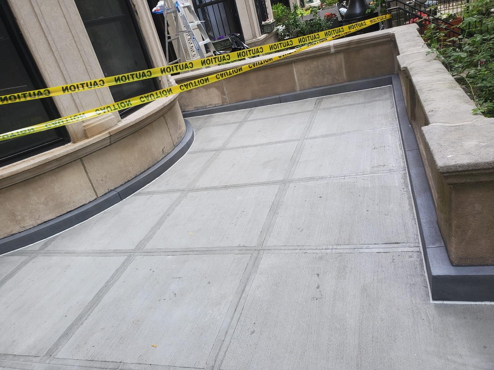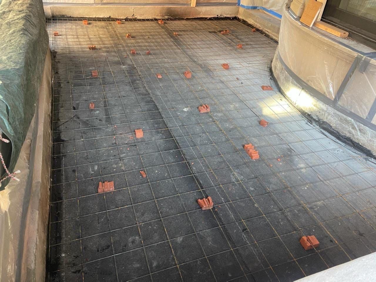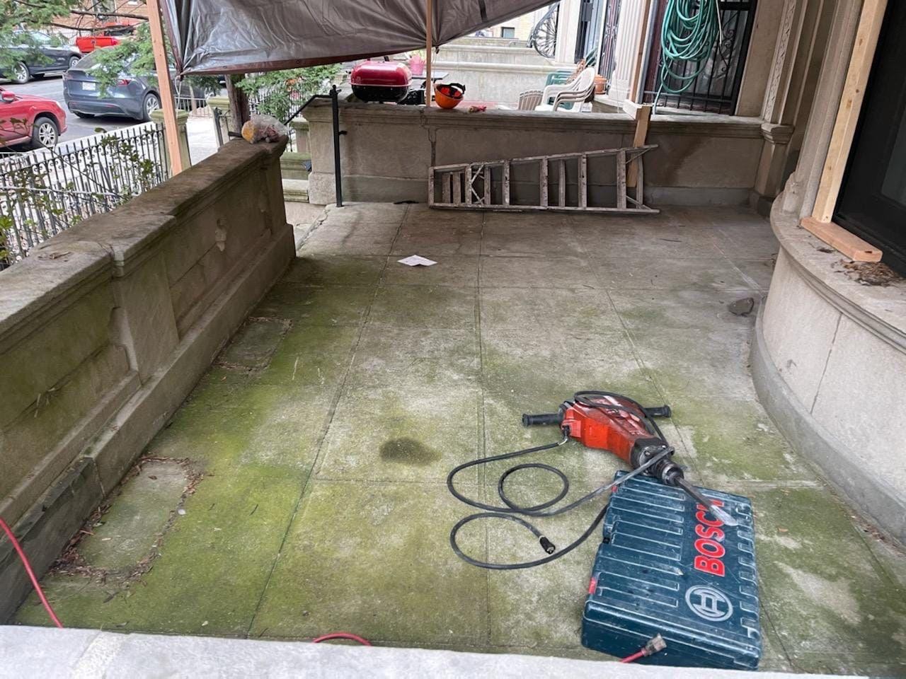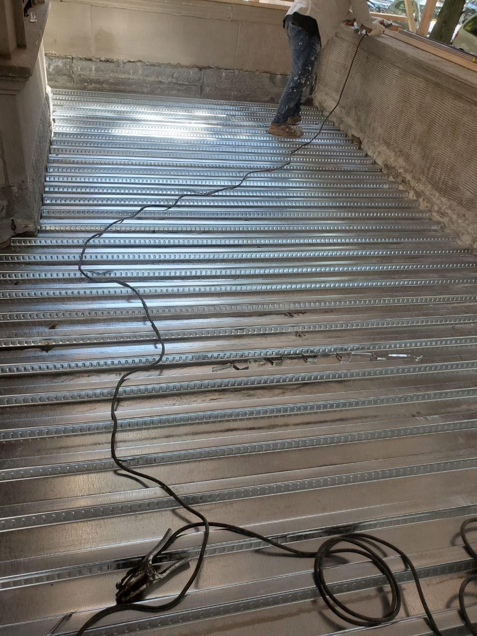 Demo the front yard. Then install metal sheets and beams. Next, install plywood, felt paper, and a roof over the metal sheets. After that, apply wire mesh and install 5” 4000 PSI concrete cement.