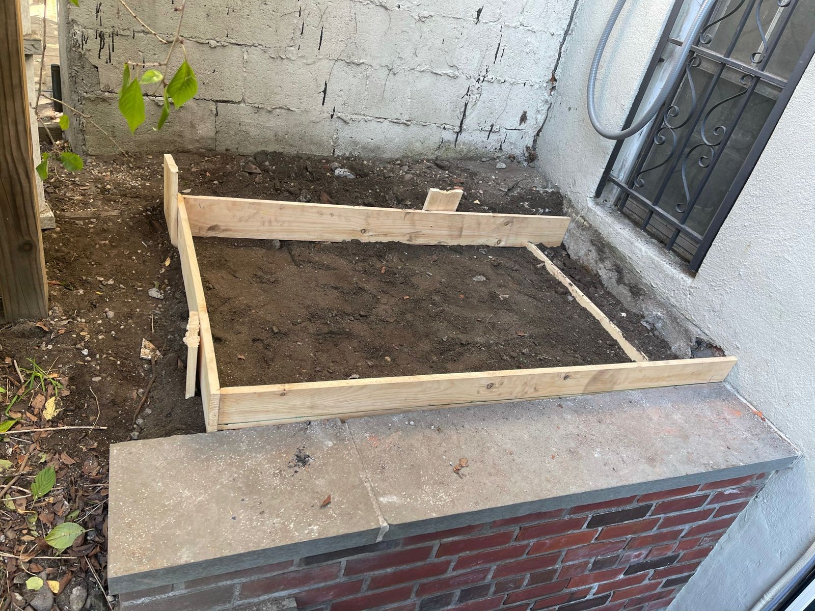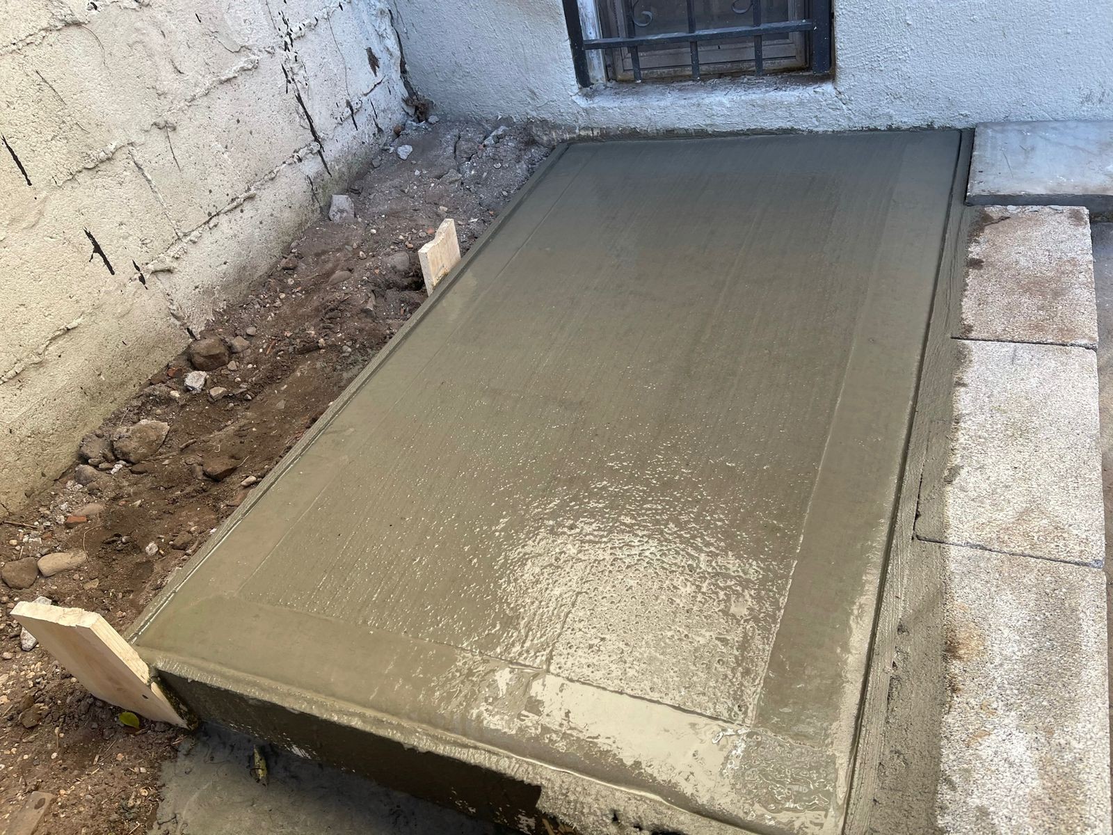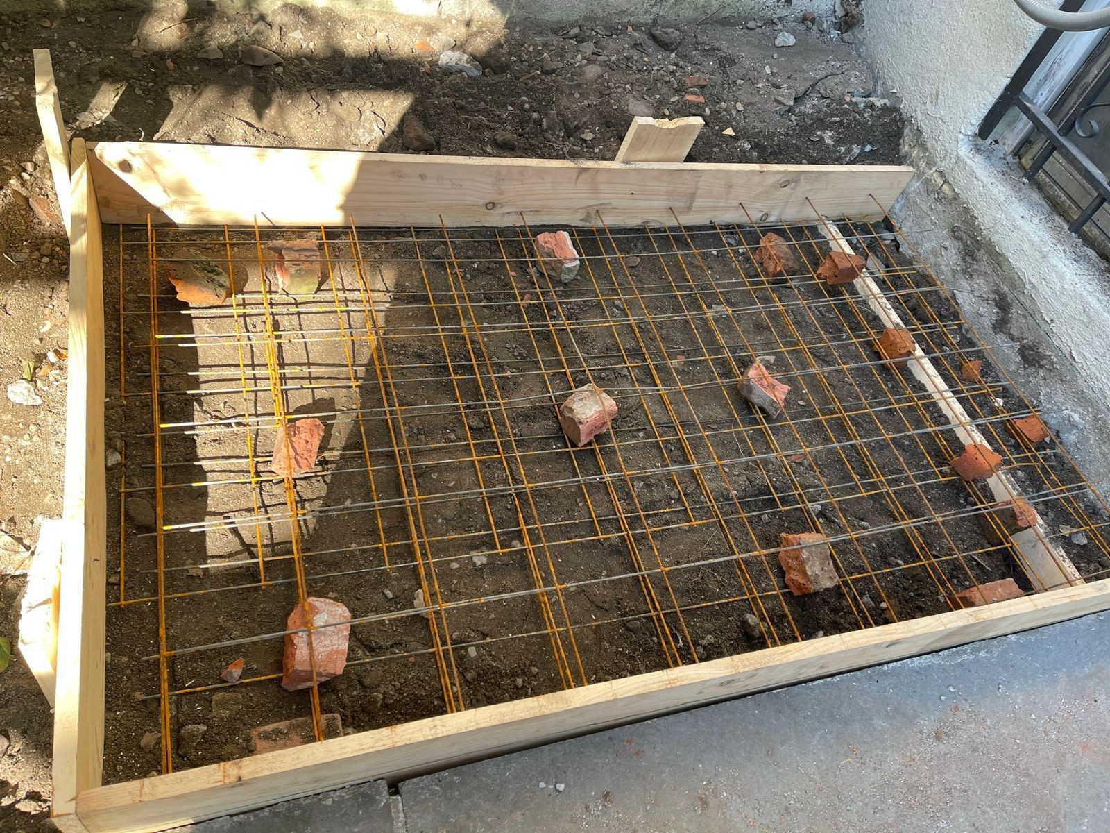 Backyard building air conditioning, lower part down 6 inches then wire mesh after concrete mix